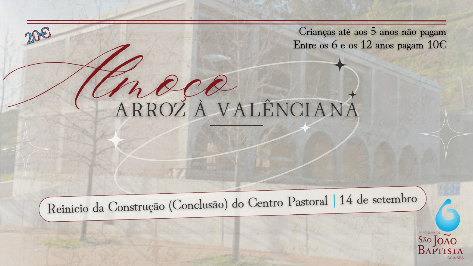 No próximo dia 14 de setembro, realizar-se-á, na Paróquia de S. João Baptista, mais um almoço para angariar fundos para a construção do Centro Pastoral. Desta vez, assinala-se o reinício da construção (conclusão) do Centro Pastoral. Como iguaria teremos Arroz à Valenciana, com alternativa sem marisco para quem é alérgico ou não gosta.