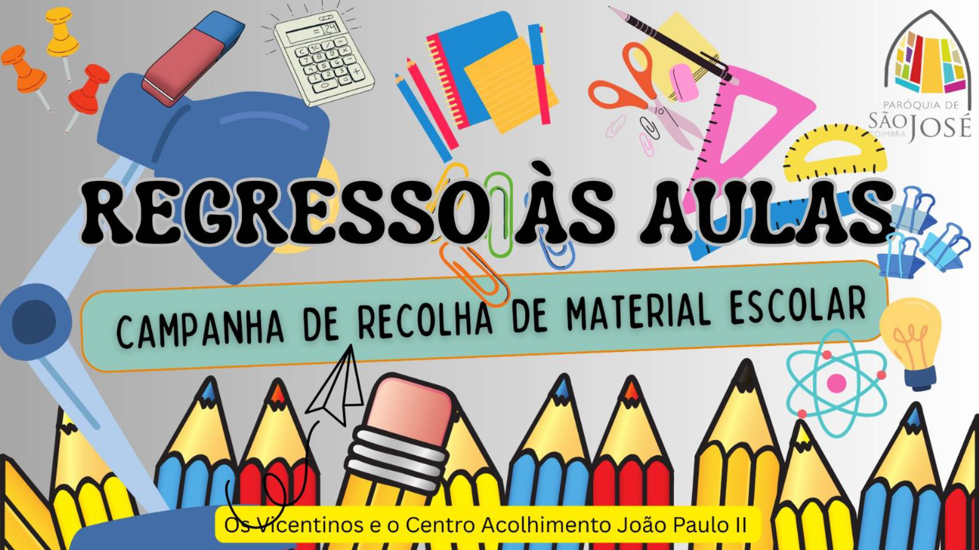 Os Vicentinos e o Centro Acolhimento João Paulo II vão estar à porta da Igreja de S. José, durante as missas do mês de setembro, a recolher material escolar (novo ou usado) ou donativos para ajudar crianças de famílias que não têm possibilidades económicas para adquirir esse material. Podem entregar os vossos donativos à porta da Igreja durante as missas ou deixar na Sacristia. Que Deus recompense a vossa generosidade!