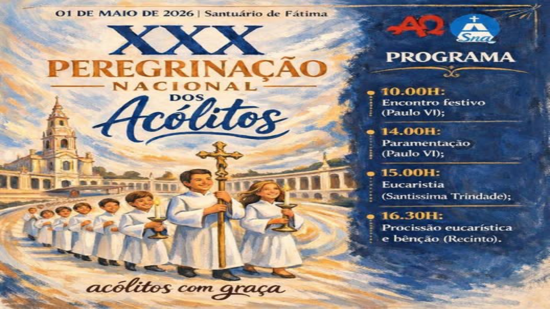 Todos os acólitos da Unidade Pastoral são convidados a participar na peregrinação nacional ao Santuário de Fátima com milhares de acólitos de todo o país. A peregrinação realiza-se já na próxima sexta-feira, 1 de maio, e trata-se de uma oportunidade que desafiamos todos a aproveitar.